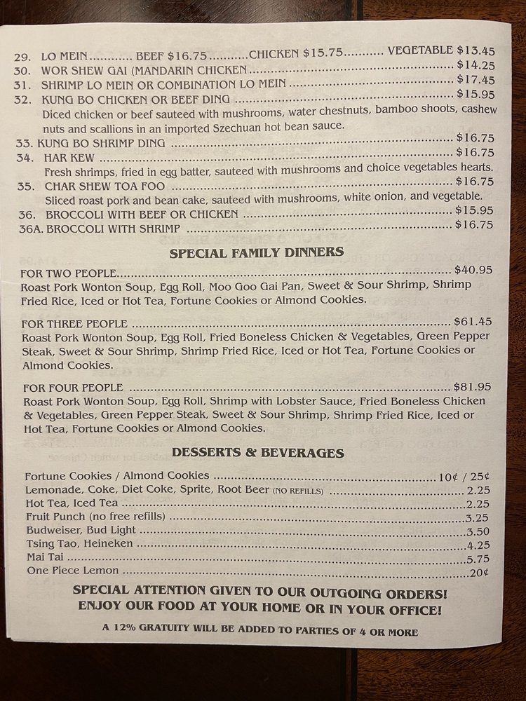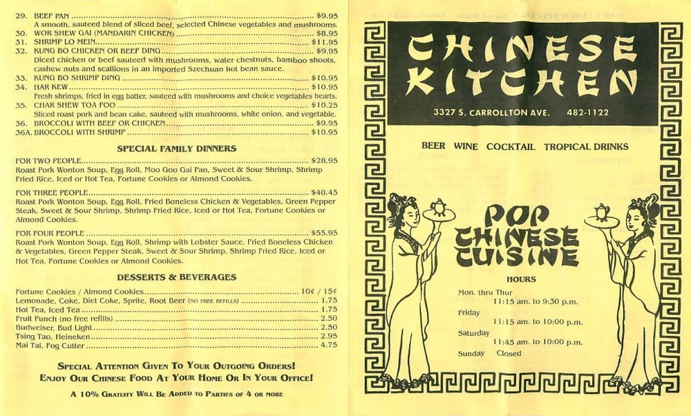 Chinese Kitchen is a casual dining spot in New Orleans, known for its authentic Chinese cuisine. The menu offers a variety of appetizers, including signature items like Chinese BarBQue Pork and Fried Wonton. Their Large Shrimp Fried Rice and Yat Ka Mein Soup are must-try dishes that showcase the fresh ingredients and traditional flavors. Customers rave about the generous portion sizes and quick service, making it a go-to spot for those craving Chinese food. The restaurant also offers delivery, takeout, and catering services, catering to a wide range of dining preferences. Overall, Chinese Kitchen is a popular choice for satisfying your Chinese food cravings with its flavorful dishes and efficient service.