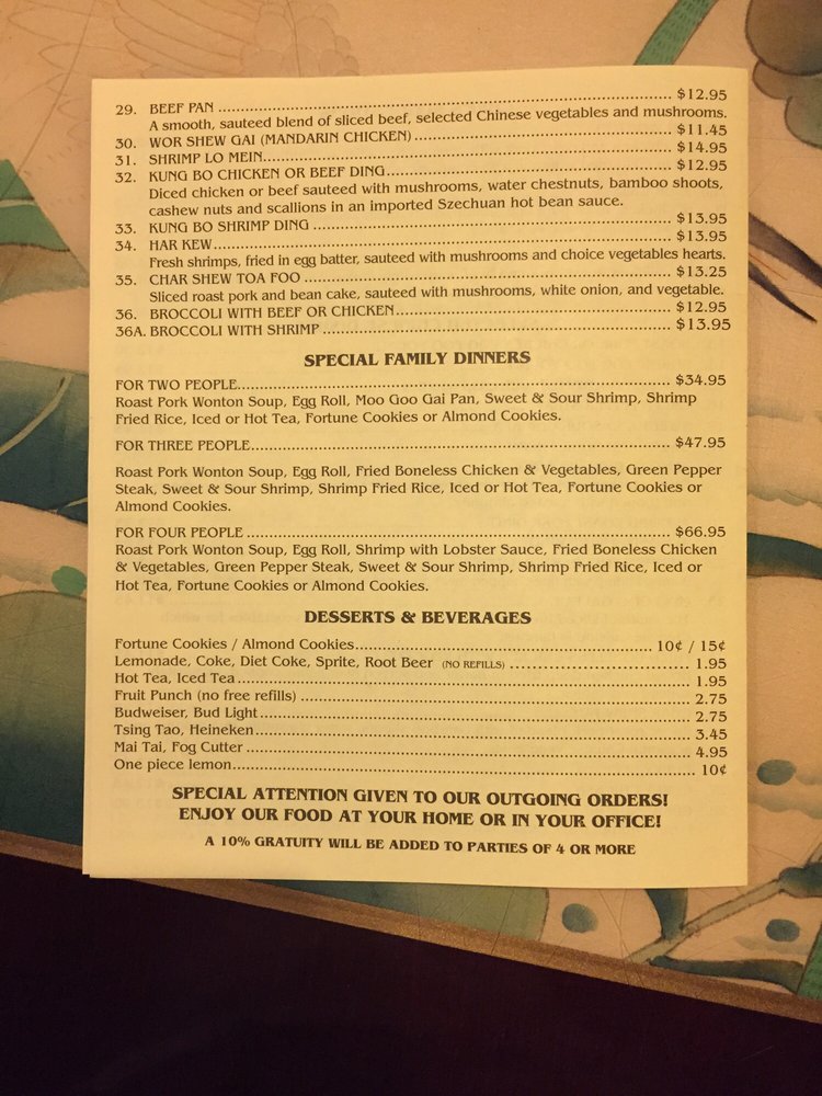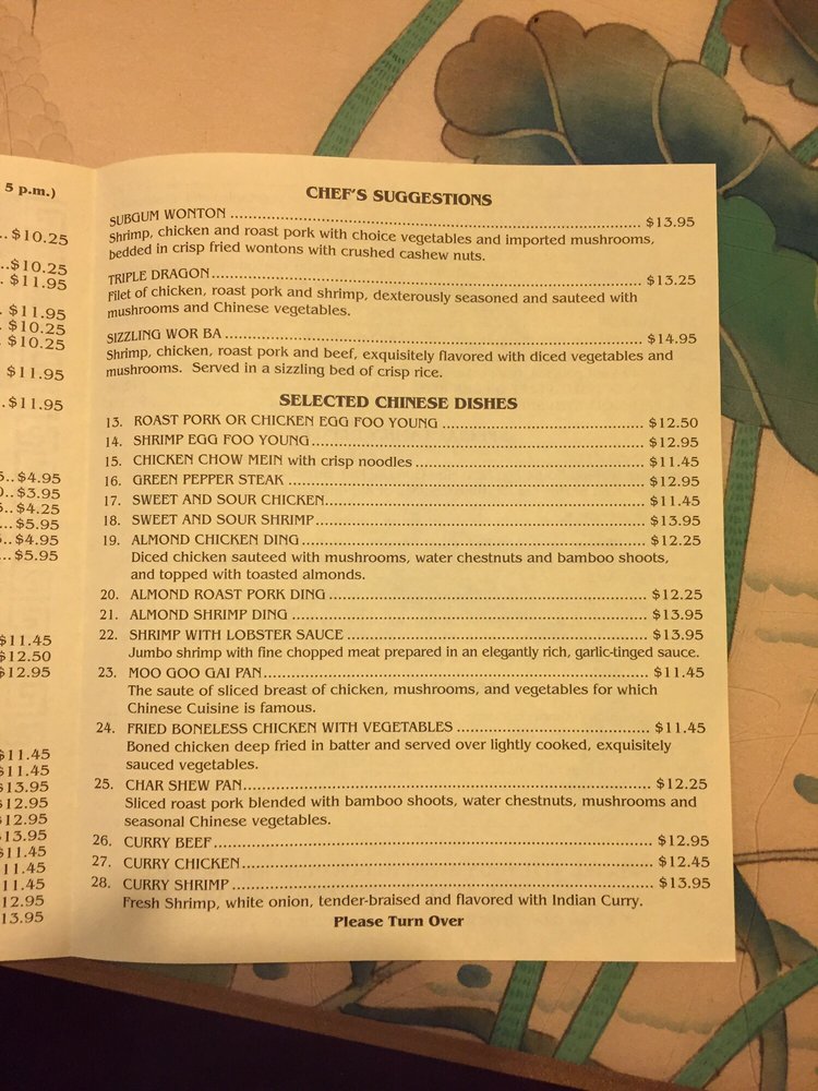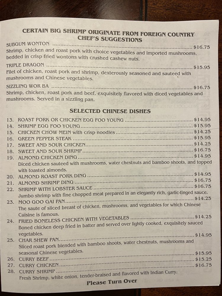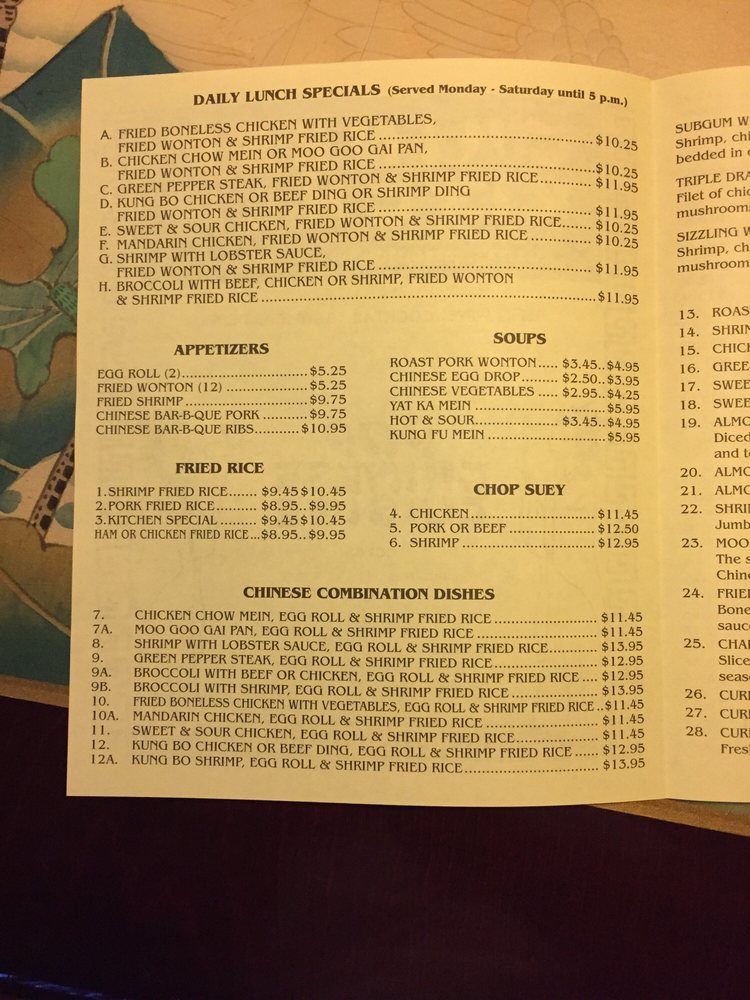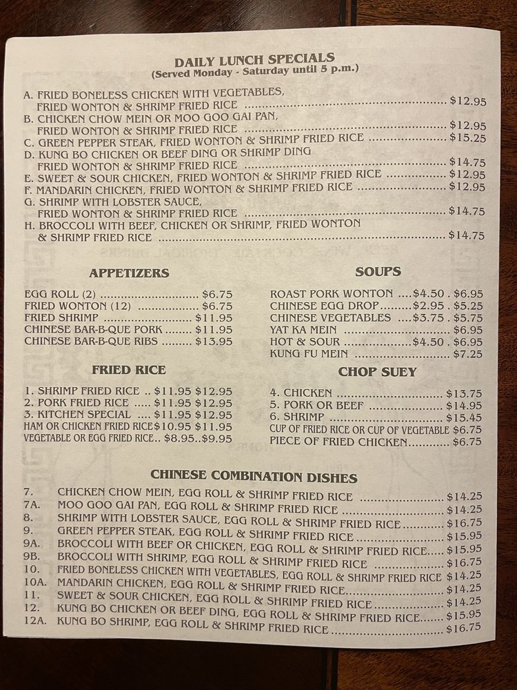 Roast pork wonton soup, egg roll, shrimp with lobster sauce, fried boneless chicken and vegetables, green pepper steak, sweet and sour shrimp, shrimp fried rice